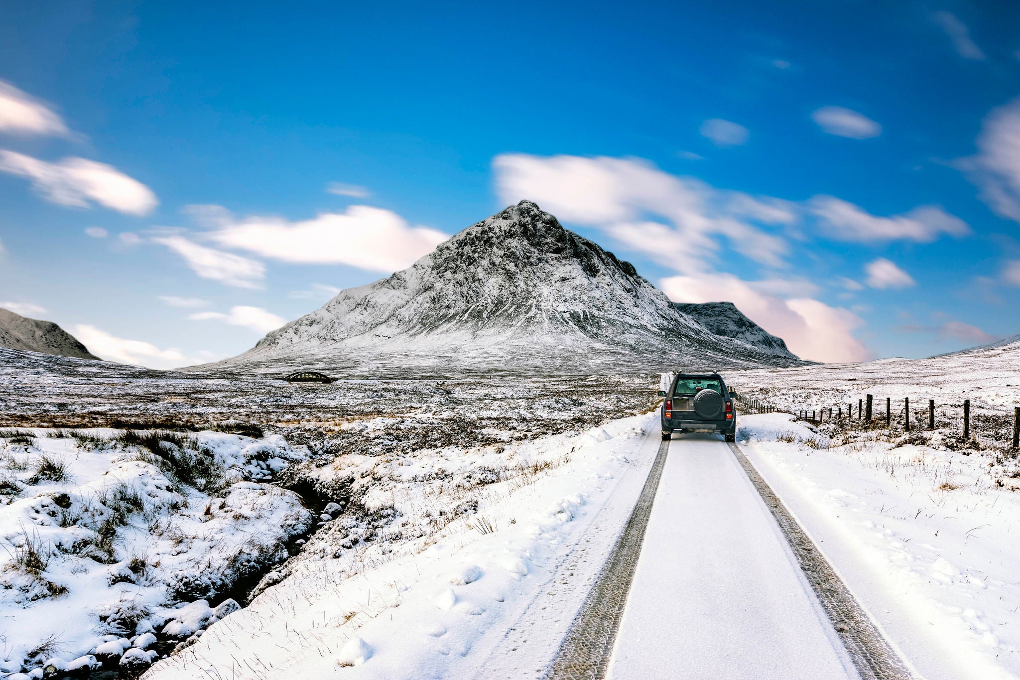 Four wheel drive vehicle with Buachaille Etive Mor, Glencoe, Scotland, UK