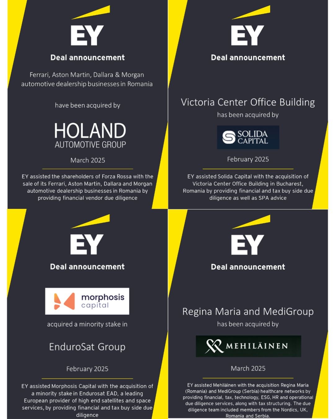 Romanian deal-makers recorded five outbound transactions (10% share) during this quarter, reenforcing the confidence of domestic investors for overseas targets seen during 2024. Three outbound transactions stood out in Q1 2025: Morphosis Capital’s minority investment in Endurosat, a leading European provider of high-end satellites and space services, where EY provided financial and tax due diligence services to Morphosis; BitDefender’s acquisition of BitShield Malaysia and Med Life’s acquisition of Moldova-based All Clinic.