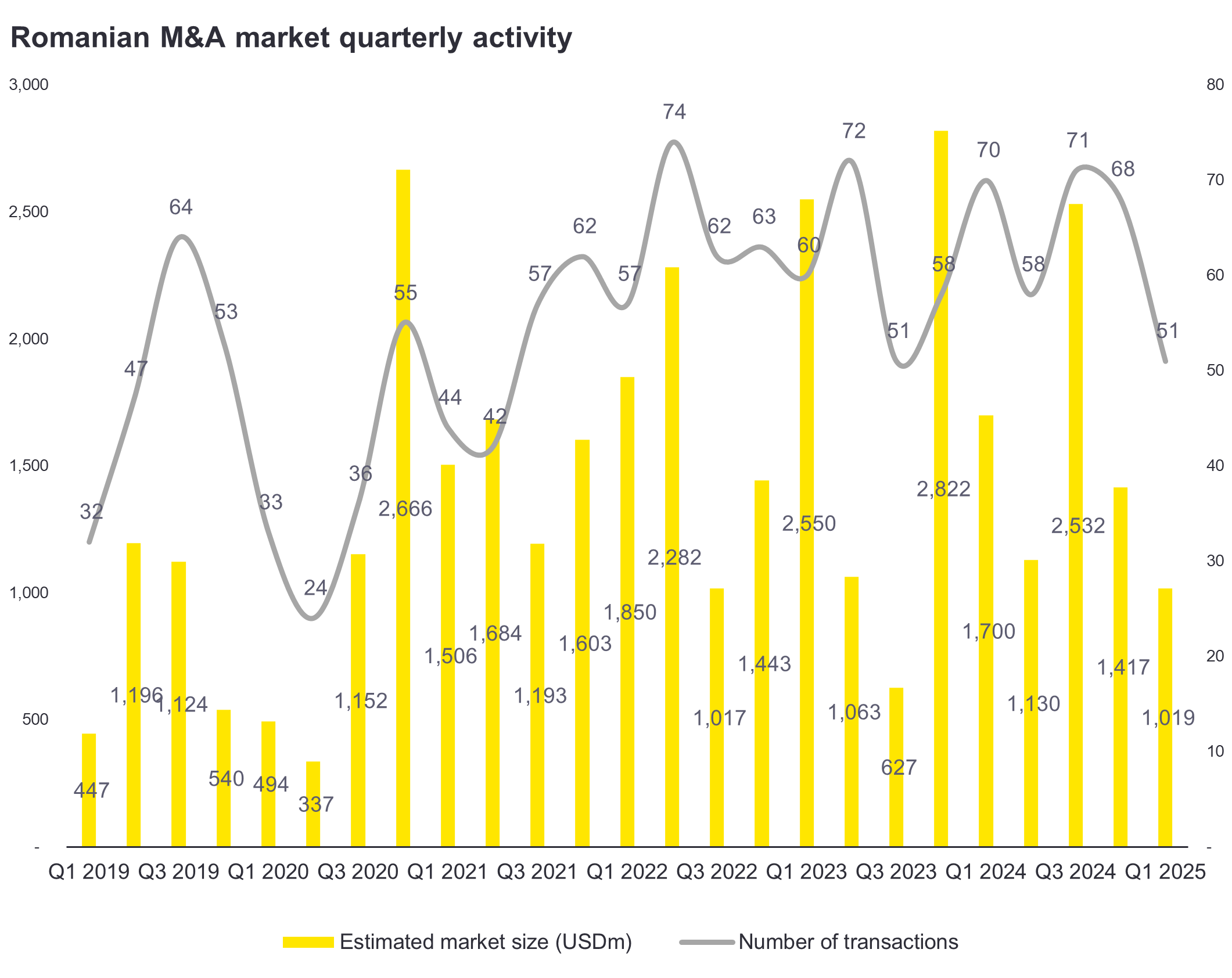 During the first three months of 2025, the Romanian mergers and acquisitions (M&A) market recorded 51 transactions1, with an estimated combined value of USD 1.0bn2 reflecting a 25% decline in the number of deals (68) and 29% fall in the value (USD 1.4bn) of M&A compared to Q4 2024. The lower level of deal-making was largely due to a slow start to the year with January 2025 recording the lowest number of deals (10) since September 2023 (12), while activity was more in line with the 2024 average monthly run-rate in February and March 2025. The lower estimated value of Romanian M&A in Q1 2025 was impacted by the record share of transactions with undisclosed deal value (84%).