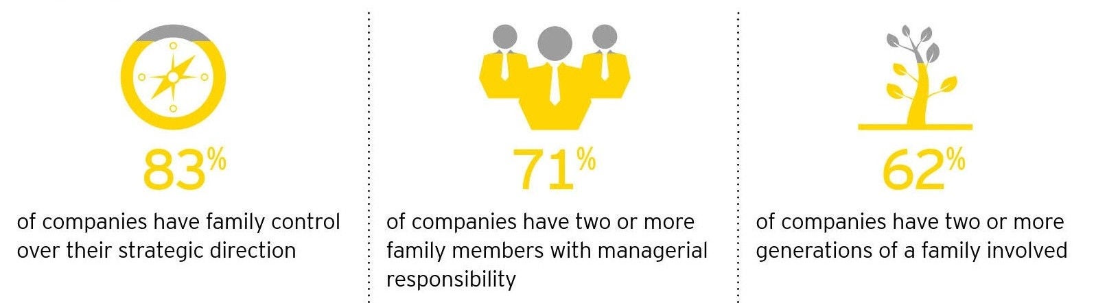 In 83 % of the companies the family controls strategic decisions and 71 % of companies have two or more family members with managerial responsibility. Two or more generations of the family are involved in 62% of the companies.