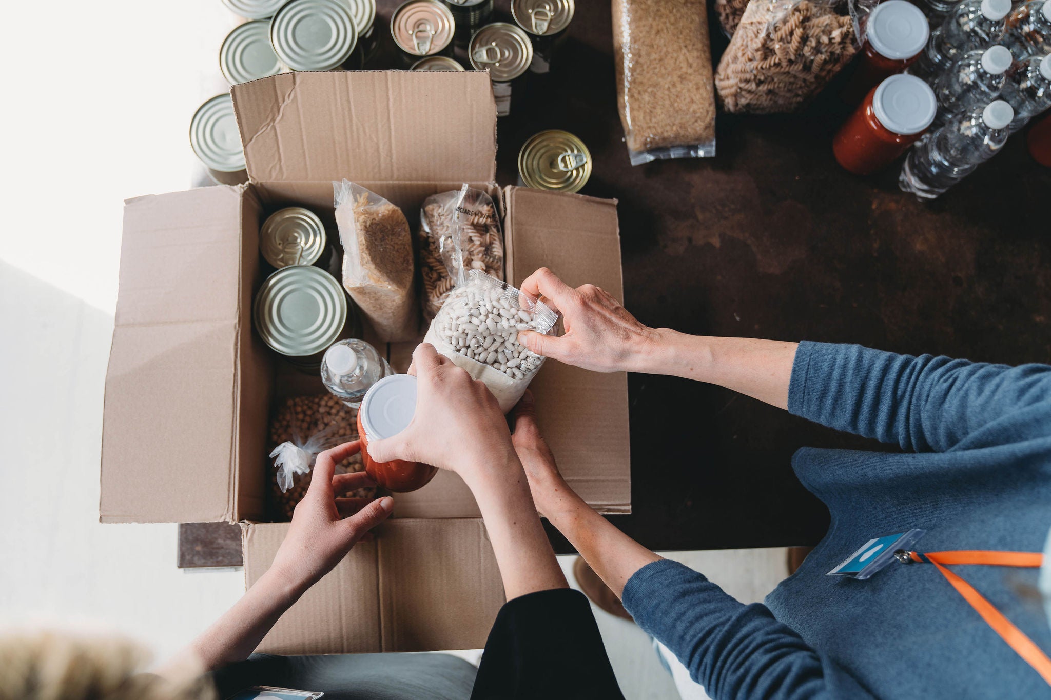 High angle view of volunteers preparing a box of food and drink at the food and clothes bank. Pov view of people arranging a cardboard box.