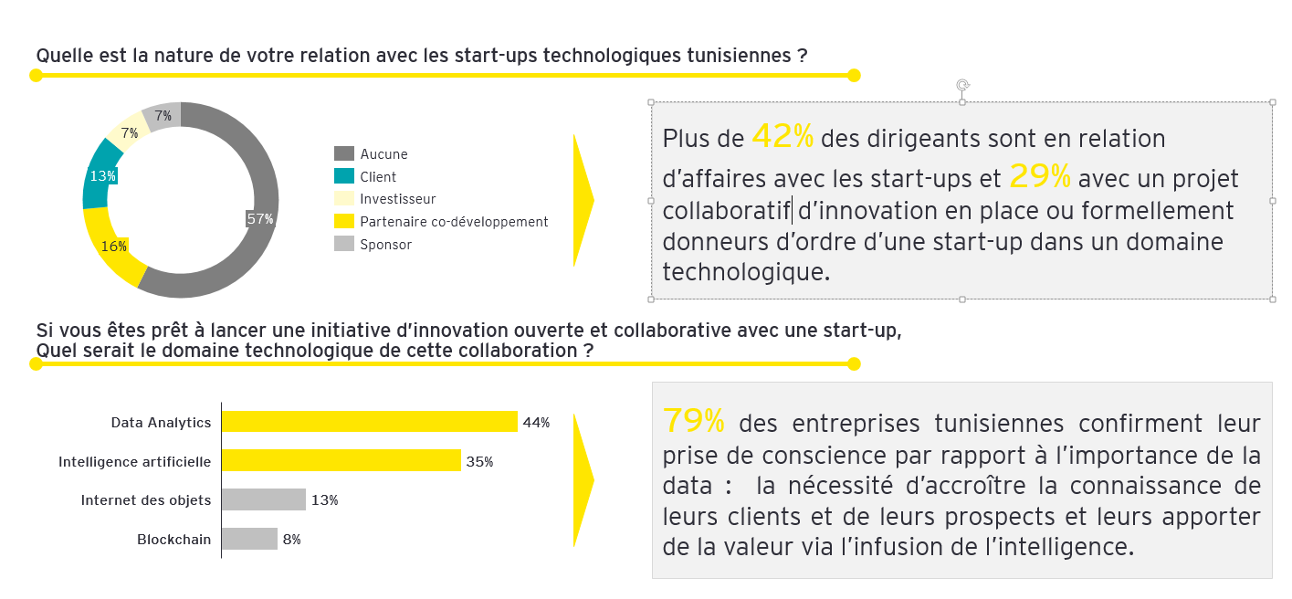 Après le focus sur la succession et de la transmission dans les entreprises familiales lors du baromètre 2019, EY a adressé cette année la thématique de la collaboration avec l’écosystème de l’innovation tunisien. L’édition 2020 du baromètre montre que ce sujet progresse chez les dirigeants d’entreprises. Ils sont aujourd’hui plus de 42% à être en relation d’affaires avec les start-ups et 29% avec un projet collaboratif d’innovation en place ou formellement donneurs d’ordre d’une start-up dans des domaines comme le data analytics et l’intelligence artificielle.