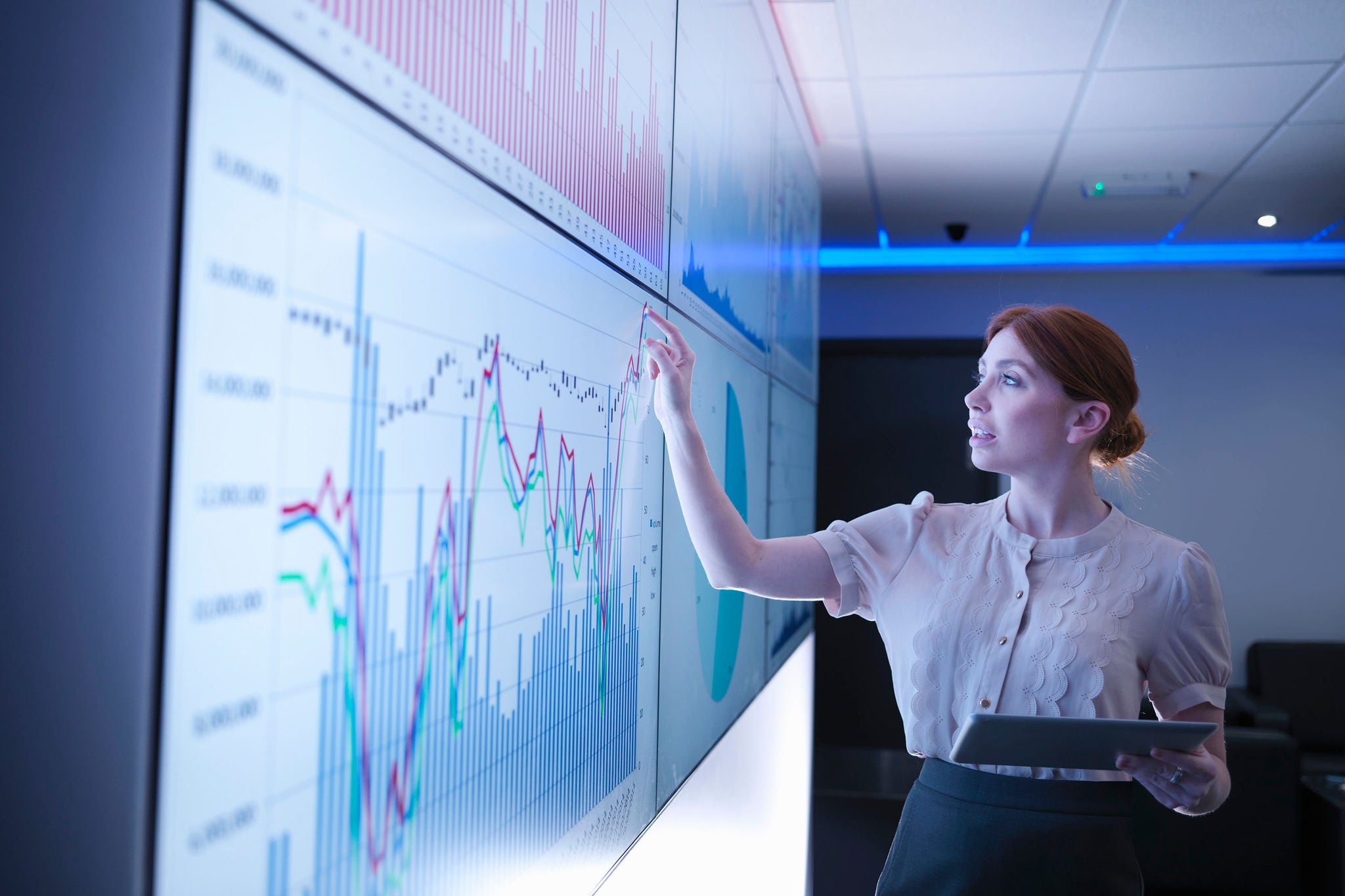 Businesswoman studying graphs on screens