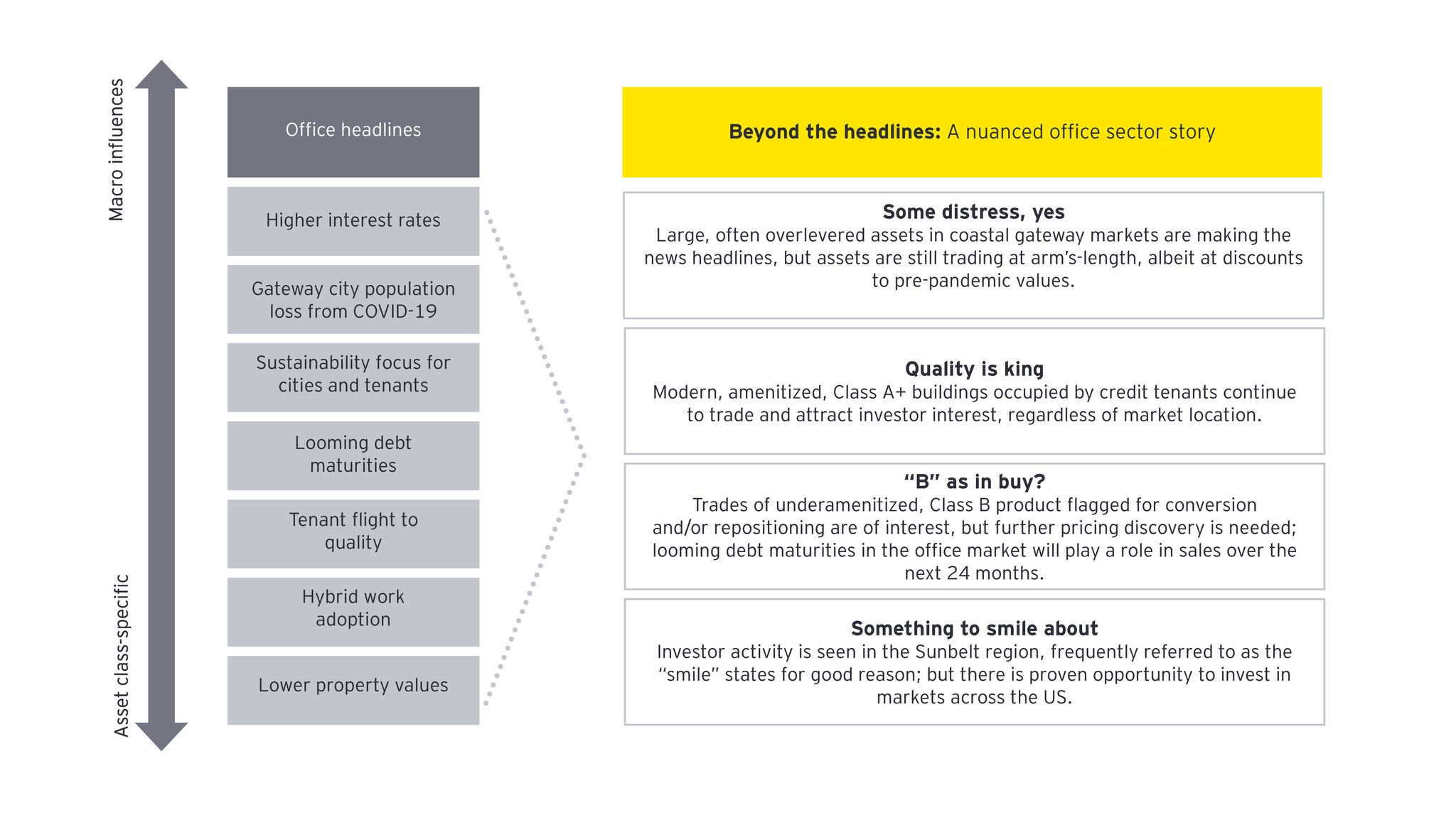 Even in strained economic conditions and tighter lending environments, there will still be multiple pathways for investment in office. Favorably positioned Class A+ buildings will continue to transact and operate as office for the foreseeable future. And Class B and C properties are ripe to transact upon future pricing discovery, holding the potential for repositioning and/or repurposing to alternate property uses by opportunistic capital.