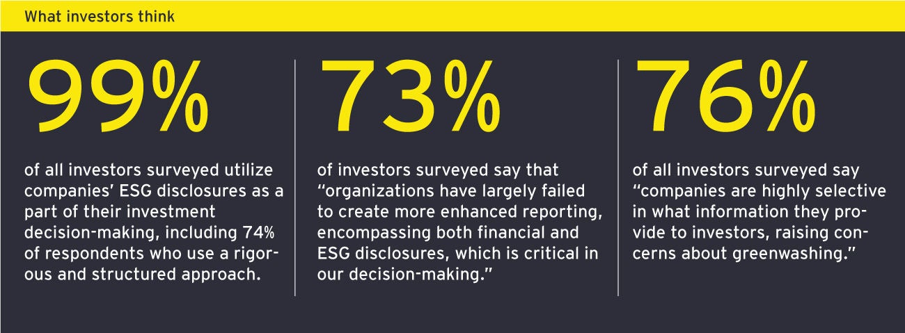 The EY Global Corporate Reporting and Institutional Investor Survey finds a significant reporting disconnect with investors on ESG disclosures. Learn more.
