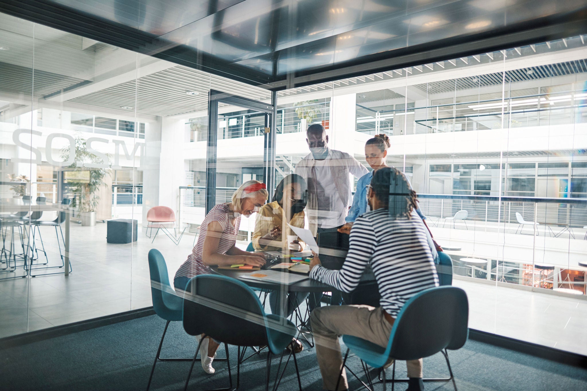 Laughing team of diverse businesspeople talking together during a meeting in a glass walled boardroom of a modern office