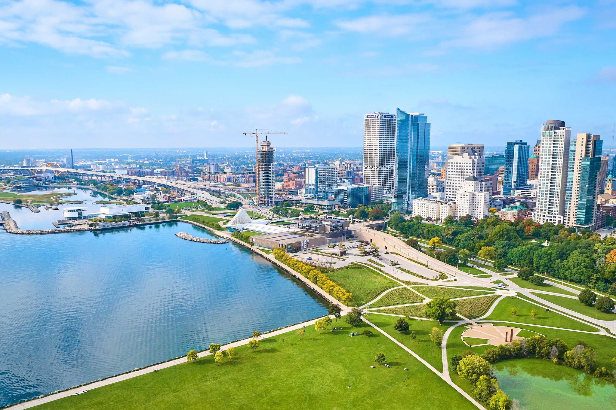 Vista aérea del paseo marítimo y el parque urbano de Milwaukee