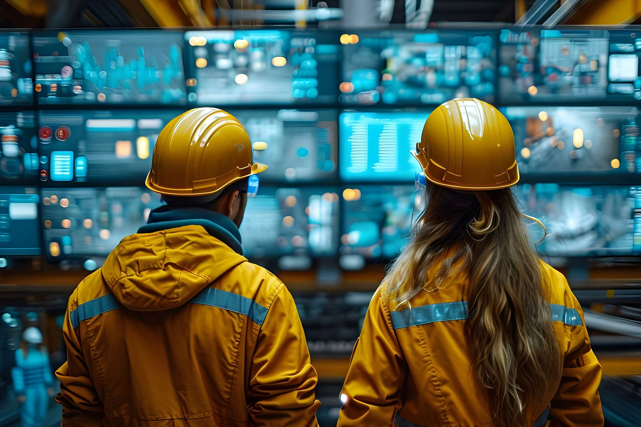 Hombre y mujer vestidos con casco y uniforme amarillo miran monitores