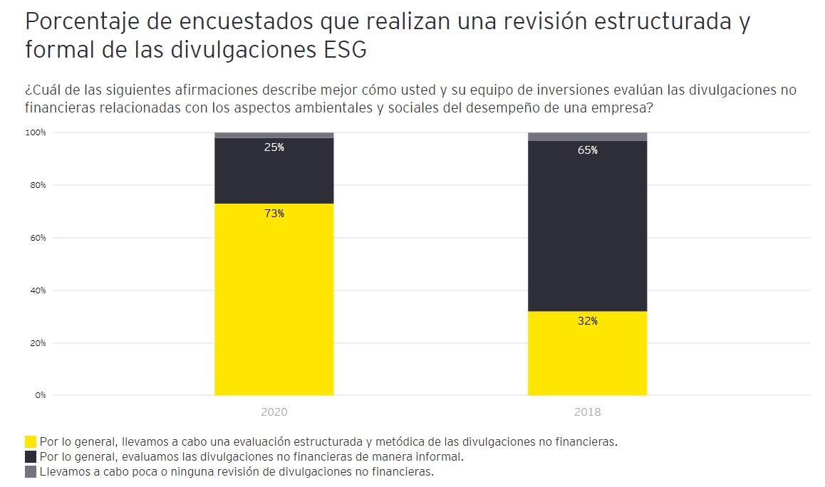 A grandes rasgos, la encuesta indica que los inversores demandan una mayor claridad y solidez de la información reportada, así como una estandarización de los mecanismos de divulgación para facilitar su toma de decisiones de inversión: