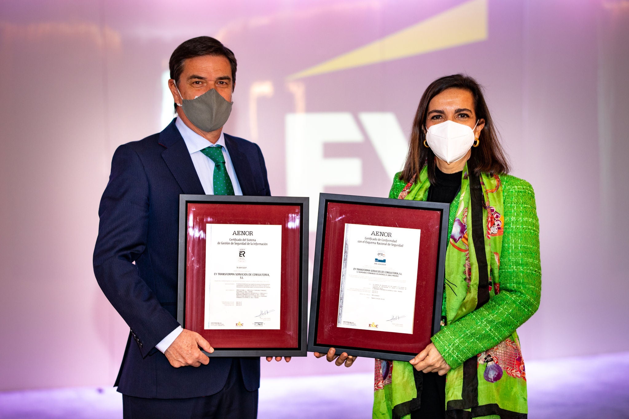Ambas certificaciones, obtenidas como consecuencia de un amplio y exhaustivo proceso, fueron entregadas por Gonzalo Piédrola, director de AENOR para la Región Centro & EMEA, a Elena Maestre, Socia responsable de Ciberseguridad de EY.