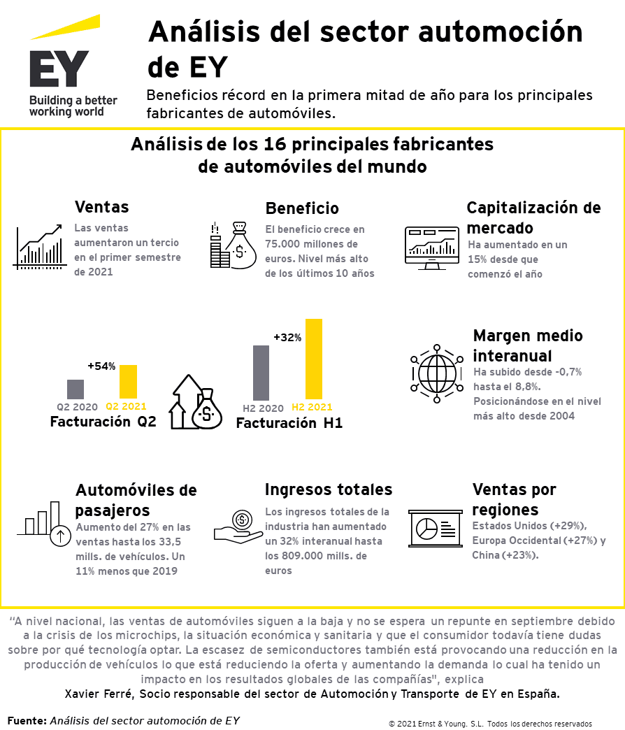 A pesar de la escasez de semiconductores y de las tensiones en las cadenas de suministro, la industria automotriz mundial generó un nivel de ganancias durante la primera mitad del año nunca visto antes. Las 16 principales compañías automovilísticas del mundo alcanzaron en el primer semestre del año un beneficio operativo total de 71.500 millones de euros, tras la pérdida de 4.100 millones de euros en el mismo periodo del año anterior, según el análisis realizado por EY.