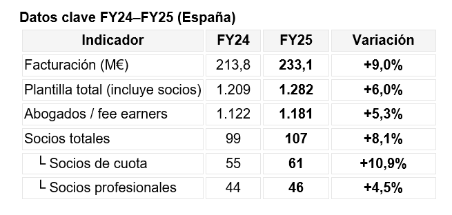 En el ejercicio fiscal cerrado el 30 de junio de 2025, EY Abogados alcanzó en España una facturación de 233,1 millones de euros, un 9% más respecto al año anterior. El despacho creció en todas sus magnitudes, incluyendo su plantilla, que ascendió un 6% hasta las 1.282 personas, de las cuales 1.181 son abogados o fee earners. Respecto al número de socios, la cifra alcanza los 107, siendo 38 de ellos, mujeres. Dentro de éstos, 61 son socios de cuota y 46 socios profesionales.