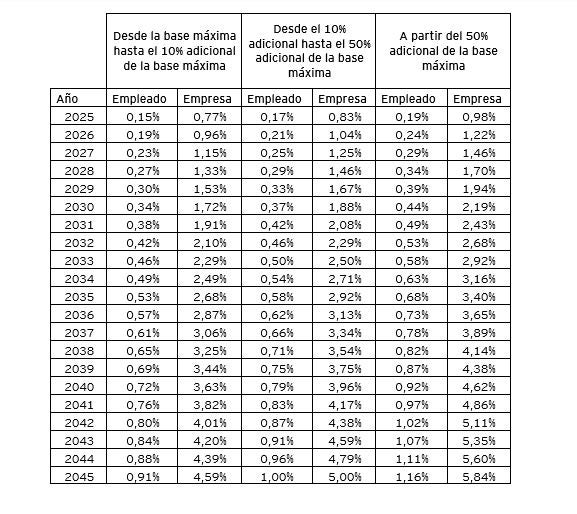 Esta medida, que se implementará gradualmente desde 2025 hasta 2045, introduce tres tramos de cotización progresiva alcanzando un incremento del 5,5%, 6% y 7%, según el exceso de la retribución sobre la base máxima de cotización. La disposición transitoria cuadragésima segunda detalla los porcentajes incrementales anuales aplicables a cada tramo de retribución: