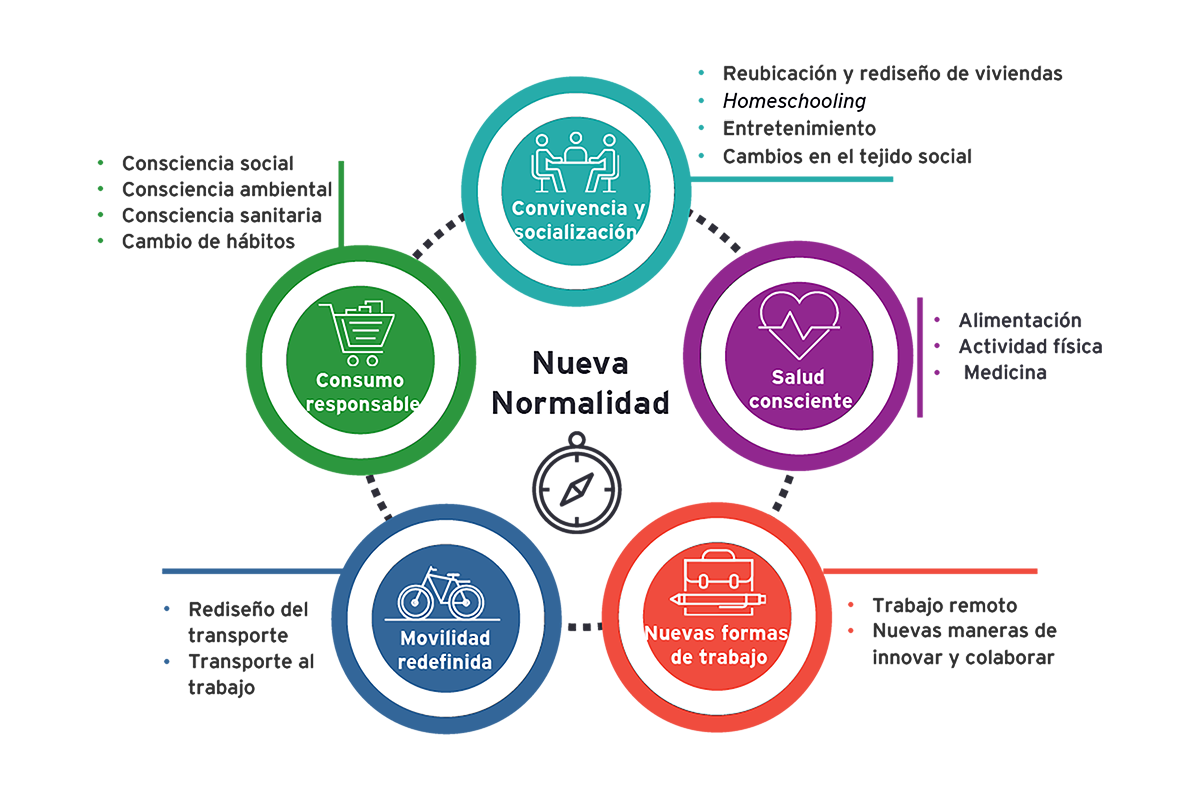 La nueva normalidad será aprender las nuevas formas de convivencia con la posibilidad de transmisión del coronavirus. Esto tiene grandes implicaciones, puesto que se deberán realizar cambios permanentes en el comportamiento de la sociedad que permitan el mantenimiento de un bajo nivel de contagio en los próximos años.1 Dentro de estos nuevos hábitos probablemente se aplicarán normas de distanciamiento social, tanto en el ámbito empresarial, como en el social y personal, incluyendo la toma de medidas rigurosas para detección temprana y aislamiento de pacientes afectados. Con todas estas medidas, ya nada volverá a ser igual y el estilo de vida será marcado por este gran hito.