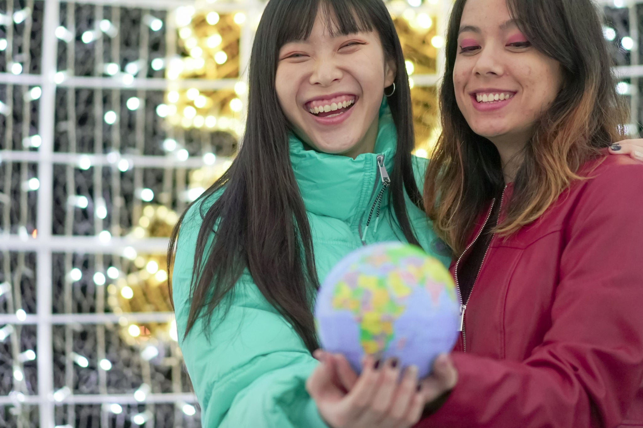 Dos mujeres sosteniendo un modelo de globo terráqueo en sus manos
