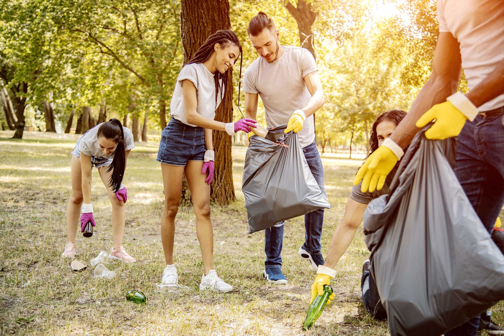 Jóvenes recolectando basura en un parque