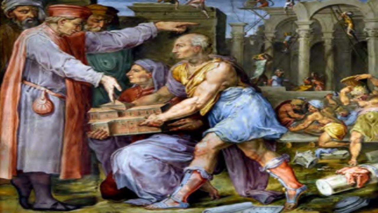 Filippo Brunelleshi y Lorenzo Ghiberti presentan a cosme el modelo de la iglesia de San Lorenzo.