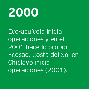 Y es así como surge Eco Acuícola con 10 has de piscigranjas para el cultivo de langostinos y 30 has para el cultivo de pimiento en este punto es importante mencionar, que lo que hoy se conoce como Ecosac Agrícola funciono bajo los libros de Eco Acuícola hasta el 2014. La idea de desarrollar negocio acuícola en Piura fue la de utilizar el agua dulce de rio en vez de agua de mar con la finalidad de evitar infecciones en la producción (que limitan la comercialización y reducen los márgenes). Y es así que empieza el negocio acuícola de langostinos a gran escala, llegando a ser el 1° exportador de langostinos (enteros y colas) en el 2014 y 2015 (hoy el grupo está dentro de los primeros 5 exportadores).