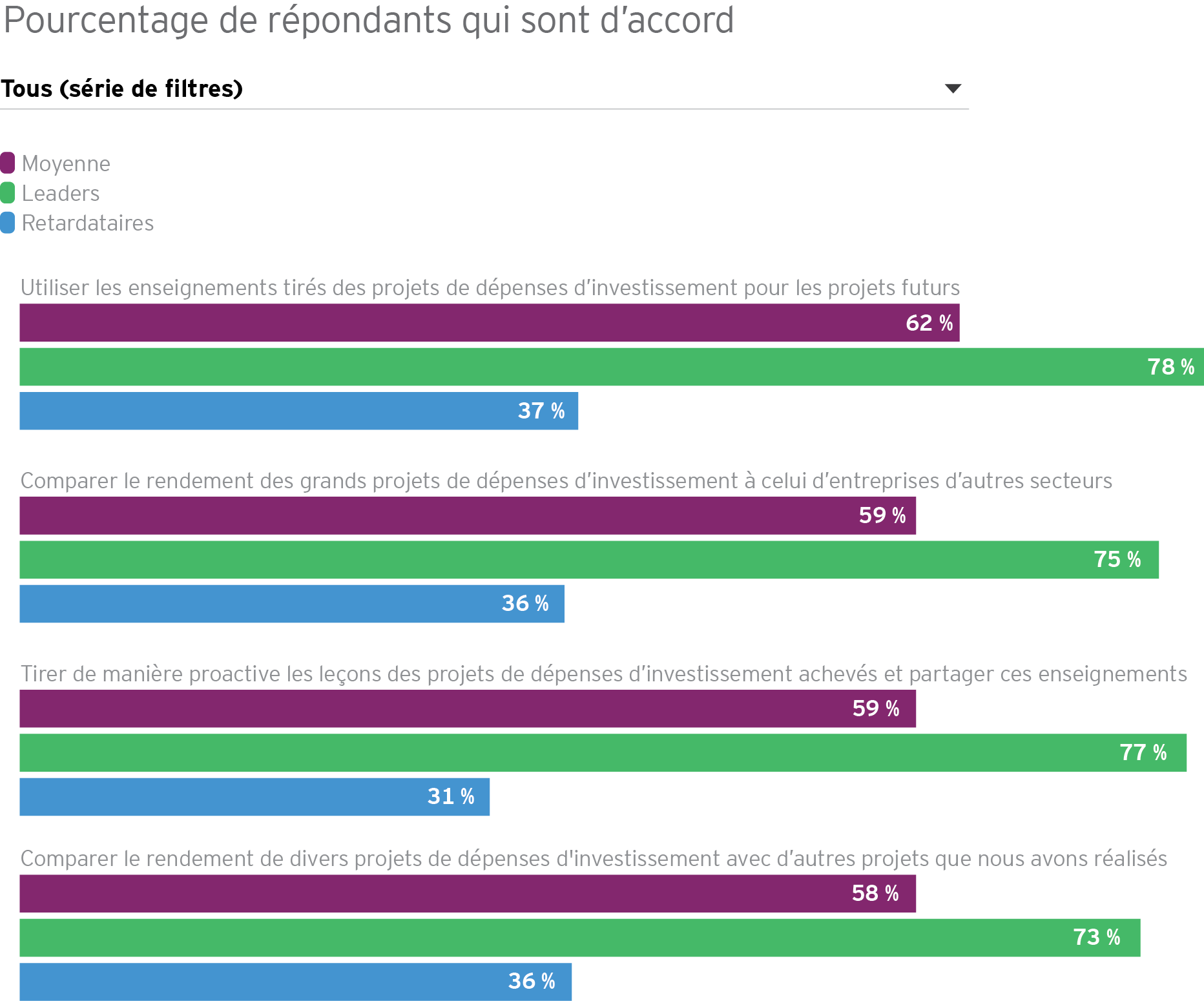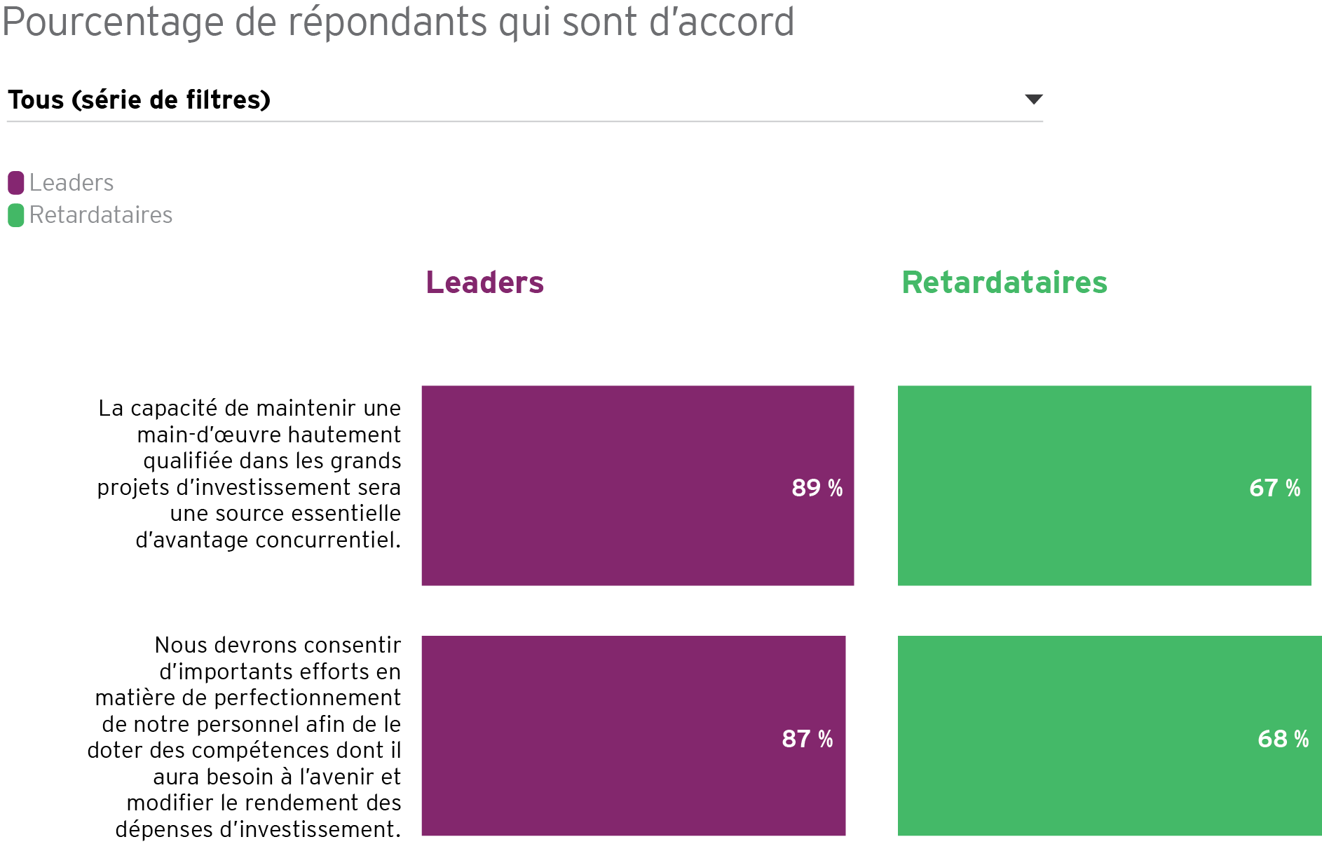 Grâce à leur degré de maturité plus élevé, les leaders ont davantage confiance dans la reprise au lendemain de la pandémie. Quatre‑vingt‑neuf pour cent des leaders sont optimistes quant à leurs perspectives de croissance, contre seulement 59 % des retardataires. Alors que la reprise s’accélère, 87 % des leaders et 69 % des retardataires estiment que le succès de leur propre reprise dépendra du maintien de leurs niveaux de dépenses d’investissement. En comparant ces données avec celles du sondage mondial d’EY sur l’affectation des capitaux, les entreprises du secteur des TMT semblent avoir un processus de planification plus structuré, suggérant une plus grande maturité tout au long du cycle de vie du capital.