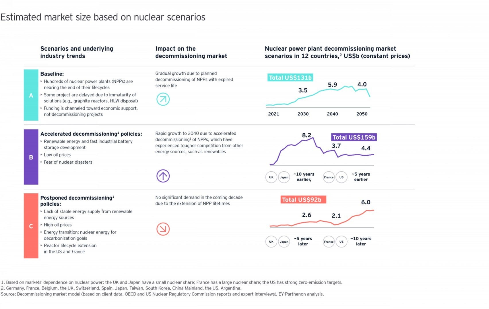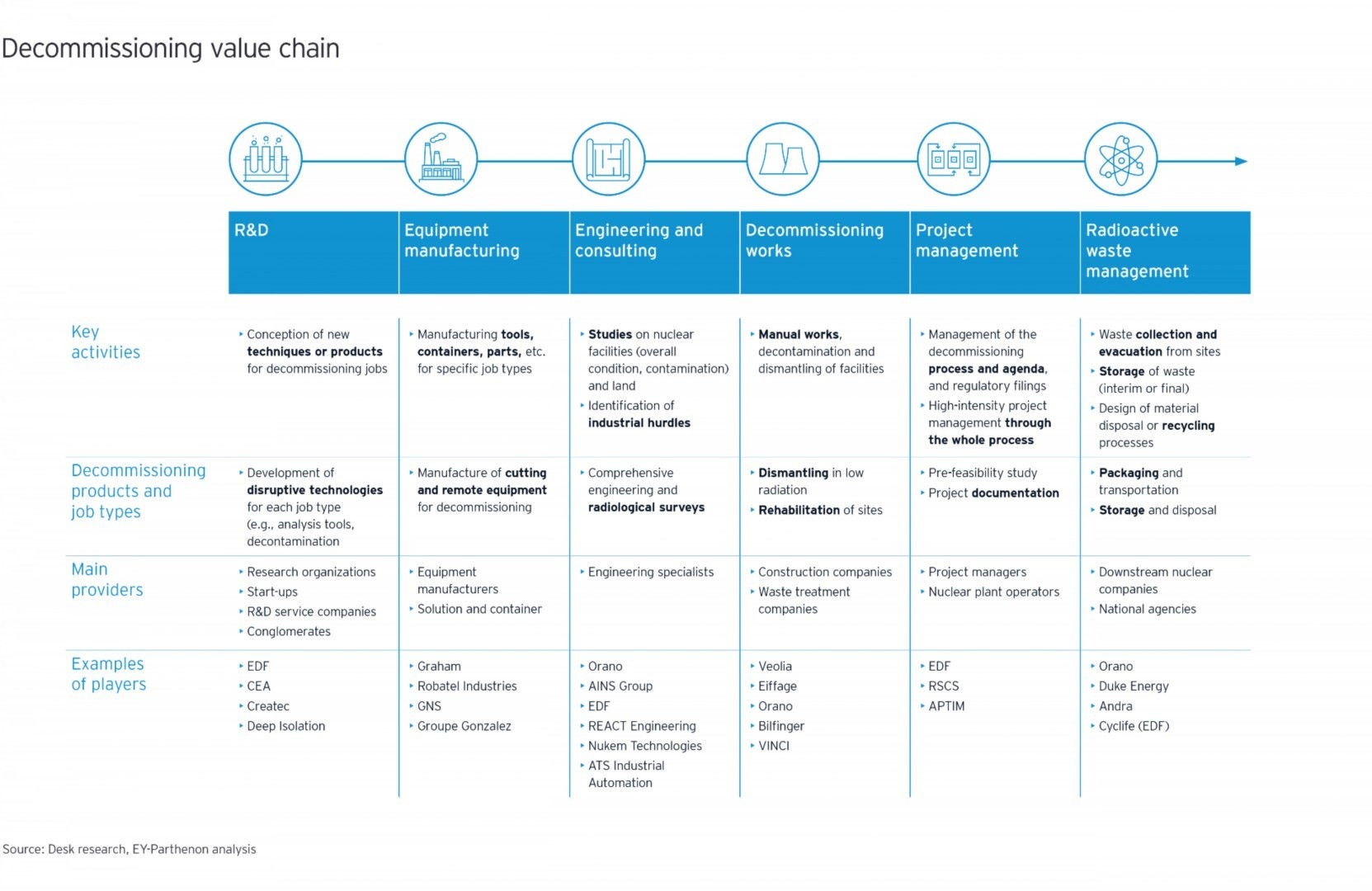 Le démantèlement d'une centrale nucléaire consiste en des projets d'une durée de ~17-20 ans, estimés à des centaines de millions de dollars. Ces projets nécessitent l'intervention d'un grand nombre d'acteurs (exploitant, entreprises de la filière nucléaire, autorités, organismes de réglementation) et la mobilisation de nombreuses capacités (par exemple, traitement de la radioactivité, gestion de projets complexes, financement).