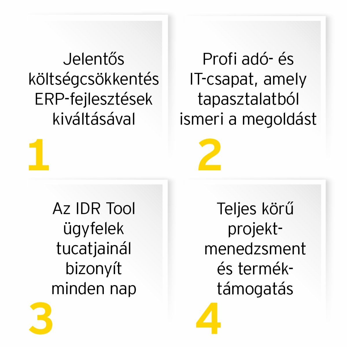 Az EY éveken át tökéletesített módszertana és szoftvere számos ponton biztosít erőforrás-megtakarítást ügyfeleinknek. Egy szoftverpéldánnyal több cég és számlázószoftver egyidejű kiszolgálása lehetséges, a megoldás az önszámlákat és a gyűjtő-helyesbítőket is kezeli, csakúgy, mint az Online Számla alapú e-számlák kibocsátását (XML+hash, PDF+hash). Szoftverünk működéséhez nem szükséges NAV-sztenderd XML-t készítenie a számlázórendszernek, teljesen testre szabható a konverzió, pl. IDOC-, CSV- vagy EDI-állományok esetén is. A legnehezebben leprogramozható adatelemeket (pl. modifyWithoutMaster, lineNumberReference, MNB-árfolyam, stb.) az IDR Tool egy-egy kapcsoló átállítása esetén automatikusan hozzá tudja adni az XML-ekhez. Így elkerülhető az ERP-rendszer költséges továbbfejlesztése.