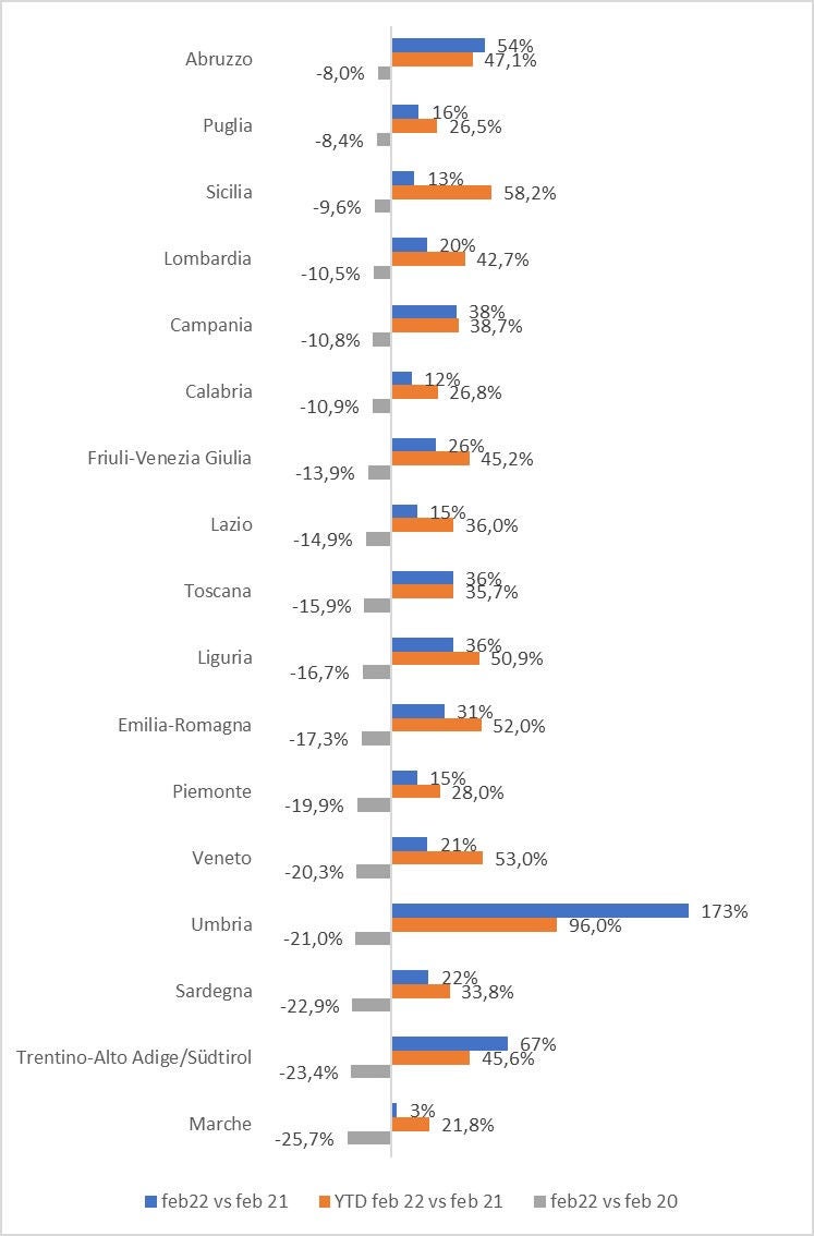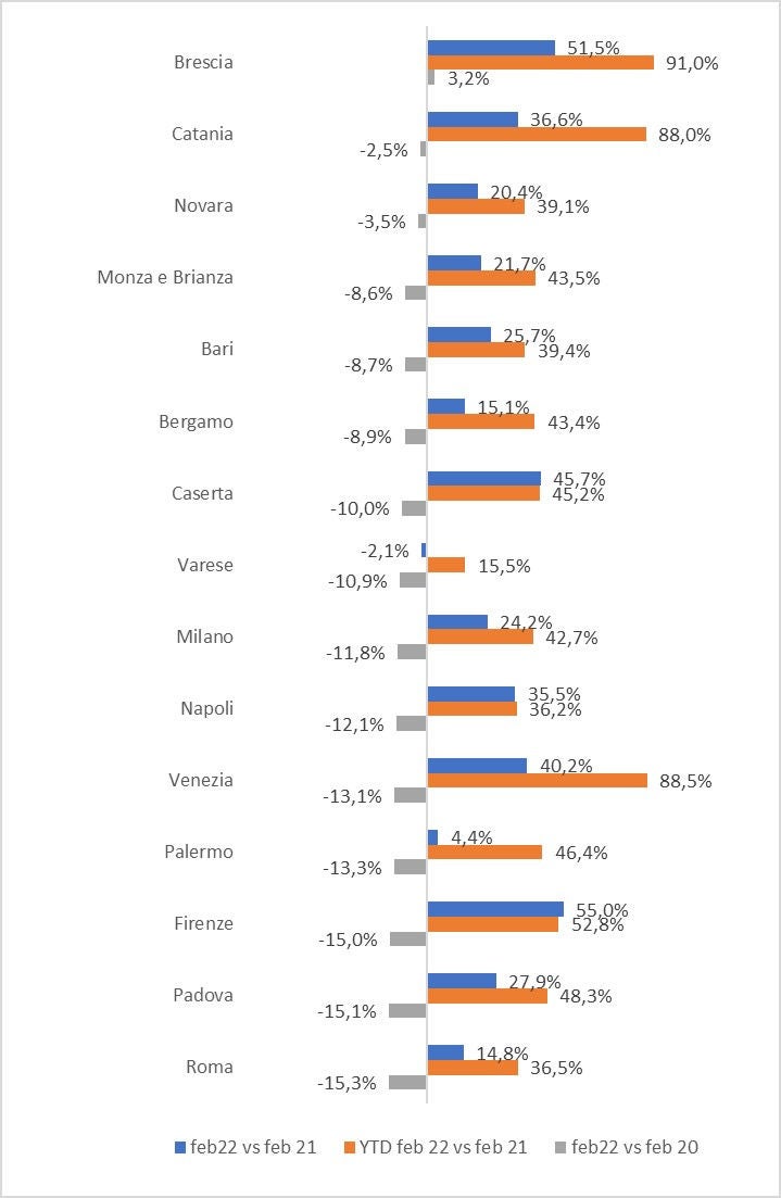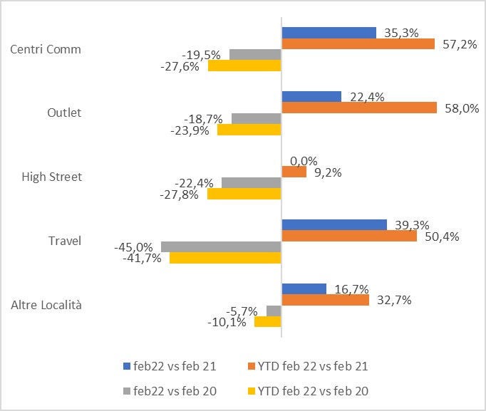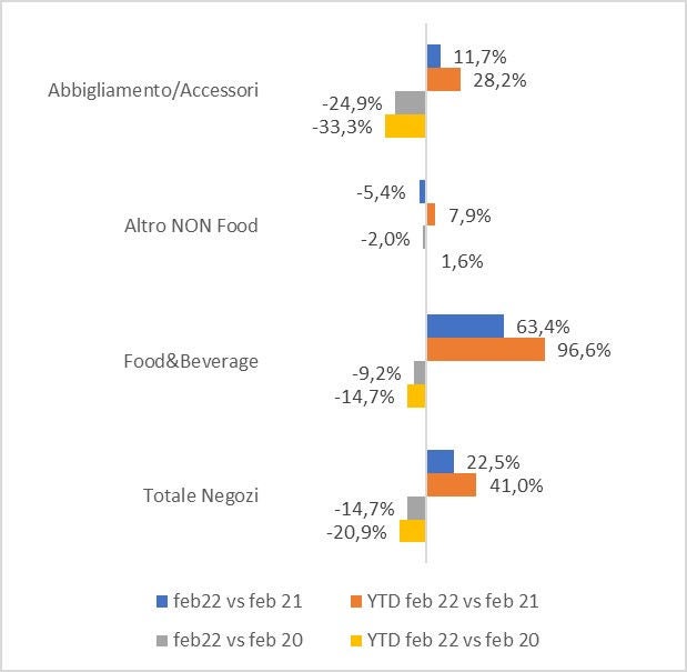 Quanto ai settori merceologici, gli andamenti più preoccupanti si avvertono in abbigliamento-accessori, che con una flessione pari a -24,9%, si conferma il settore in maggiore sofferenza. Trend meno negativi sia per la ristorazione, che chiude il mese di febbraio a -9,2% in netto miglioramento rispetto a gennaio (-18,1%), sia per il retail non food -2% ovvero prodotti di arredamento e legati alla cultura. Entrambi confermano una discreta stabilità nel riallineamento con i valori pre-pandemia.