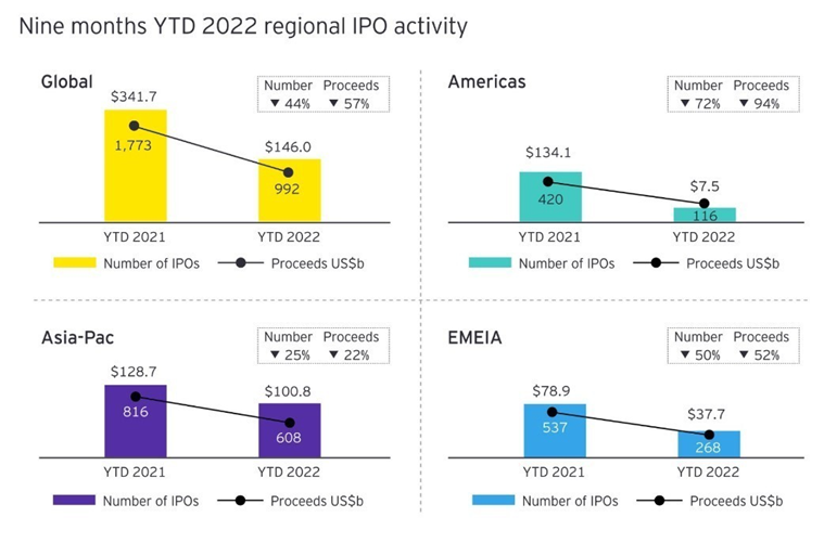 Le borse americane mostrano in generale il calo più netto, con 116 operazioni che hanno raccolto US$7,5 miliardi da inizio anno, una diminuzione del 94% dei proventi e del 72% dei volumi su base annua. In diretto contrasto con un anno da record nel 2021, l'attività IPO nei mercati americani fino ad oggi è scesa al livello più basso degli ultimi 20 anni.