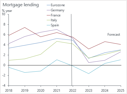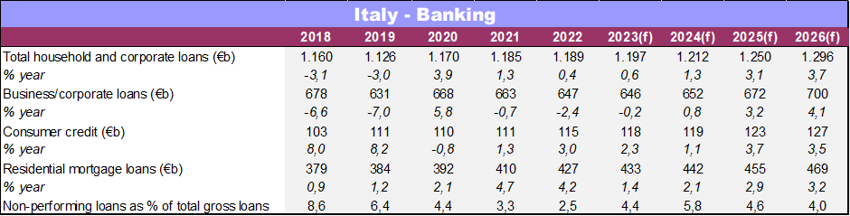 A risentire dell’attuale clima di volatilità saranno soprattutto i prestiti alle imprese, previsti in calo dello 0,2% nel 2023. Più dinamico il credito al consumo che – seppure in rallentamento rispetto al +3% segnato nel 2022 – segnerà un +2,3% nel 2023. I mutui ipotecari dovrebbero aumentare dell'1,4% nel 2023, in calo dal 4,2% del 2022.