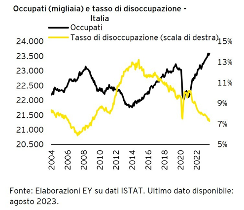 - Il mercato del lavoro è solido: si stima che il tasso di disoccupazione nel 2024 sarà poco sopra il 7%. Raggiunto il massimo storico ad agosto 2023 sul numero di occupati (circa 23,6 milioni).