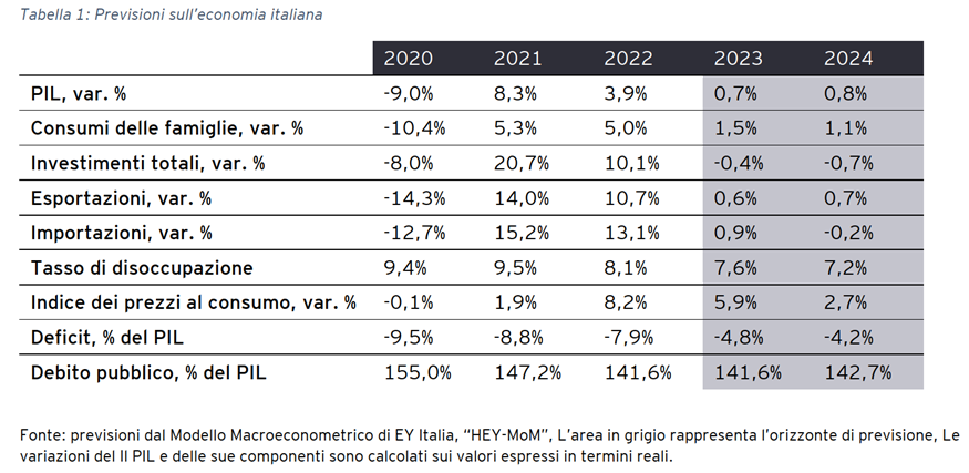 - PIL in Italia: le previsioni di EY indicano per l'Italia una crescita del PIL dello 0,7% nel 2023, con il terzo e il quarto trimestre caratterizzati da una crescita sostanzialmente piatta, e dello 0,8% nel 2024, leggermente più dinamico e con un’economia in accelerazione nella seconda parte dell’anno.