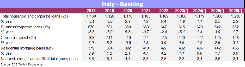 Il lungo periodo di riduzione dell’indebitamento da parte delle imprese italiane, iniziato durante la crisi del debito dell’Eurozona e temporaneamente interrotto nel 2020 e nel 2021 quando le aziende hanno fatto ricorso a programmi di prestito garantiti dal governo, è ripreso. I prestiti netti alle imprese sono diminuiti dell’8,7% a/a nel terzo trimestre del 2023, il quarto trimestre consecutivo in cui si è registrato un calo a/a, lasciando lo stock di debito societario al livello più basso dal primo trimestre del 2005 in termini di liquidità. Gli investimenti delle imprese rimarranno probabilmente molto contenuti nei prossimi trimestri, a causa dell’aumento sostenuto dei tassi di interesse e dell’incertezza sulle prospettive globali. Nel complesso, si prevede che quest’anno i prestiti netti alle imprese italiane diminuiranno del 5,1%, un’ulteriore flessione dopo il calo del 2,4% del 2022. Tuttavia, si prevede che la fine dei rialzi dei tassi di interesse potrà indurre un ritorno a una crescita modesta dell’1,4% nel 2024 e del 3% nel 2025.