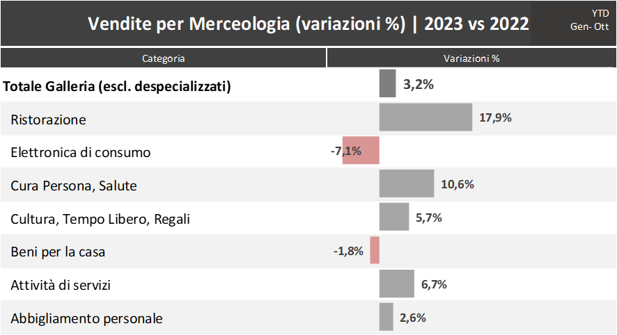 Più in dettaglio le categorie che hanno riscontrato la maggiore crescita nei dieci mesi rispetto al 2022 sono: la Ristorazione (+17,9%), la Cura Persona e Salute (+10,6%), la Cultura, tempo libero e regali (+5,7%), e i Servizi (+6,7%). L’Abbigliamento registra un +2,6%, mentre sono in calo l’Elettronica di consumo (-7,1%) e stabile i Beni per la casa (-1,8%).