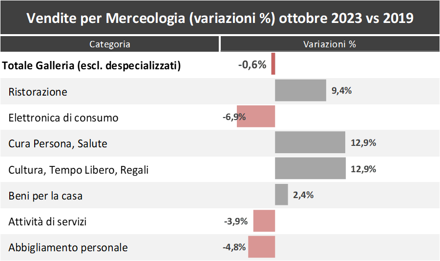 Trend un po' diversi nel confronto con il periodo pre-pandemia: mentre si conferma il calo dell’Elettronica di consumo (-6,9%) a cui si aggiunge l’Abbigliamento (-4,8%) ed i Servizi (-3,9%), si riscontrano trend positivi per la Cura Persona e Salute (+12,9%), la Cultura, Tempo Libero e Regali (+12,9%) e i Beni per la Casa (+2,4%).