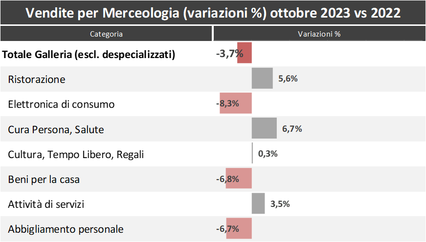 Se guardiamo al solo mese di ottobre 2023 rispetto all’ottobre 2022, si evidenzia una situazione mista, in cui vengono confermati i buoni trend di Ristorazione (+5,6%), Cura Persona e Salute (+6,7%) e Servizi (+3,5%), mentre tra i settori che registrano un calo, oltre all’Elettronica di consumo (-8,3%) vi sono da segnalare l’abbigliamento (-6,7%) ed i Beni per la casa (-6,8%). Stabile la spesa in Cultura (+0,3%).
