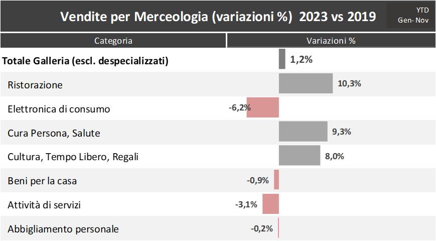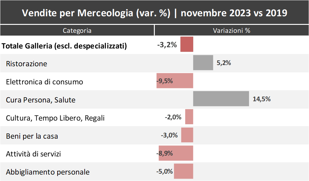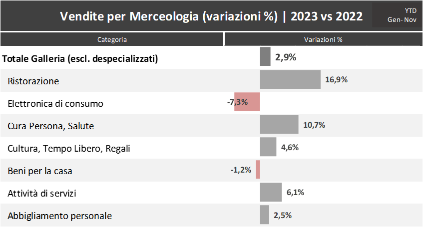 Se guardiamo al solo mese di novembre 2023, rispetto a novembre 2022, si evidenzia una situazione mista, in cui vengono confermati i buoni trend di Ristorazione (+8,1%), Cura Persona e Salute (+9,9%), stabili Abbigliamento (-0,7%) e i Servizi (-0,7%), mentre tra le categorie che registrano un calo, oltre all’Elettronica di consumo (- 4,3%), anche la Cultura, Tempo Libero, Regali (-6%) e Beni per la casa (-4,7).
