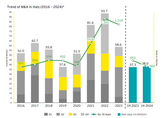 Le acquisizioni di aziende italiane all'estero sono in linea con il primo semestre 2023 in termini di numero ma diminuiscono in termini di valore, passando da 10,1 miliardi di euro a 7,1 miliardi. Tale rallentamento può essere in parte attribuito all’elevato costo del denaro e al contesto geopolitico incerto.