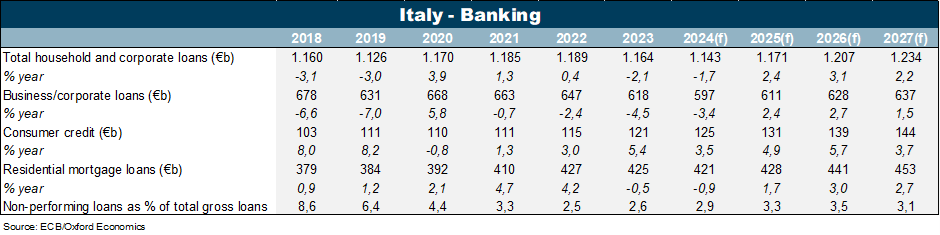 Livelli contenuti di debito rispetto ai redditi, che riflettono la continua riduzione dell'indebitamento da parte di famiglie e aziende a seguito della crisi finanziaria globale e della crisi del debito dell'Eurozona, dovrebbero ulteriormente aiutare a minimizzare eventuali futuri incrementi di NPL. Ad esempio, nel primo trimestre del 2024, in Italia la quota di NPL era equivalente a poco più del 20% del PIL, molto inferiore rispetto a quello delle altre economie dell'Eurozona. Si prevedono incrementi marginali nel 2025 e nel 2026, intorno al 3,5%, un aumento modesto rispetto agli standard del passato (il rapporto NPL è salito dal 5% nel 2009 al 9,7% nel 2012, prima di superare il 16% nel 2015).