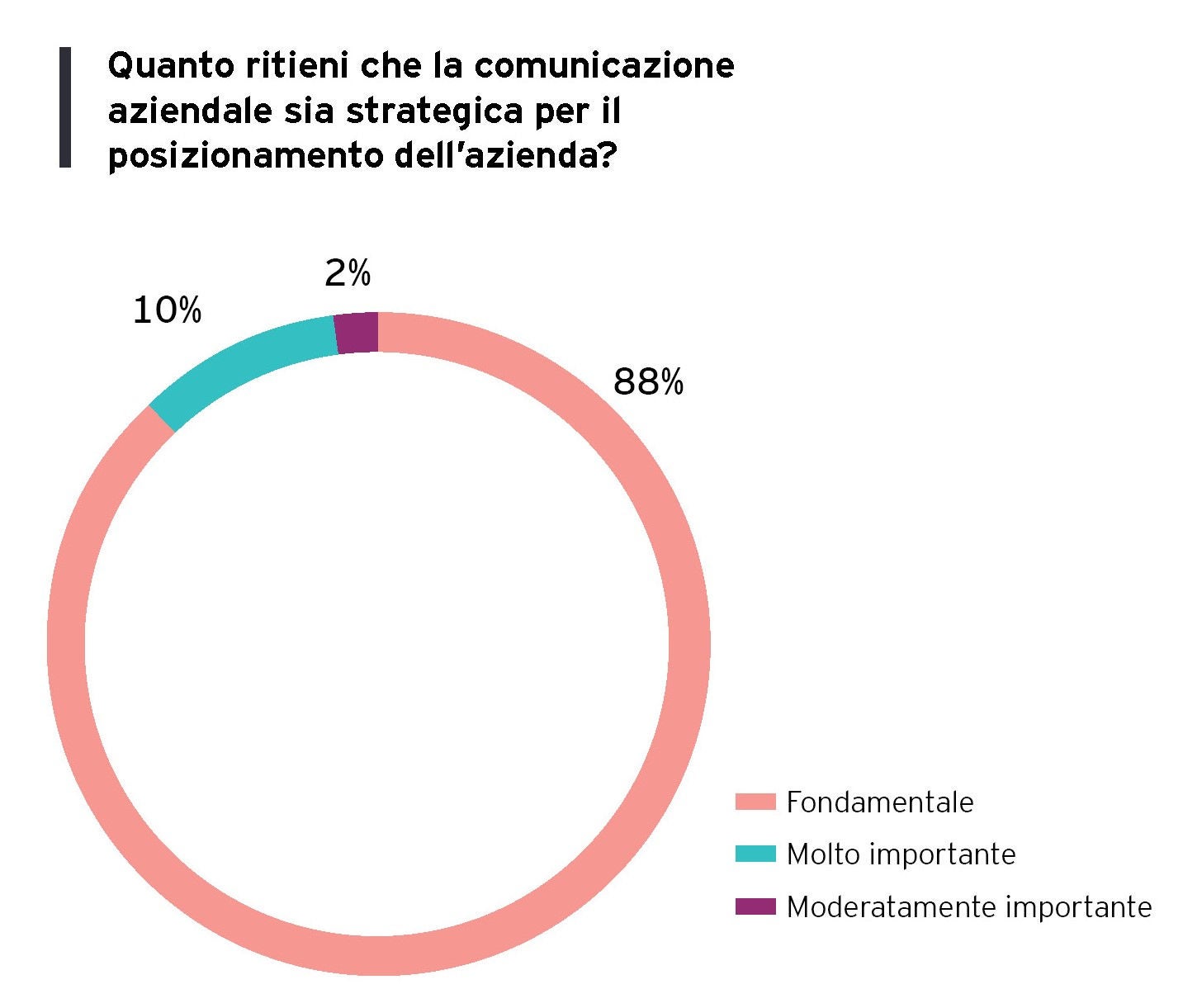 Il 67% delle aziende intervistate identifica nella costruzione e nel mantenimento della reputazione aziendale l’obiettivo principale della comunicazione esterna. La promozione di prodotti e servizi è considerata prioritaria dal 19% degli intervistati, mentre la gestione delle relazioni con gli stakeholder è importante per il 14%. Tra i temi ritenuti più rilevanti per la comunicazione del futuro ci sono ESG e valori (42%), innovazione e trasformazione digitale (31%), prodotti e servizi (19%), e risultati e performance (8%).