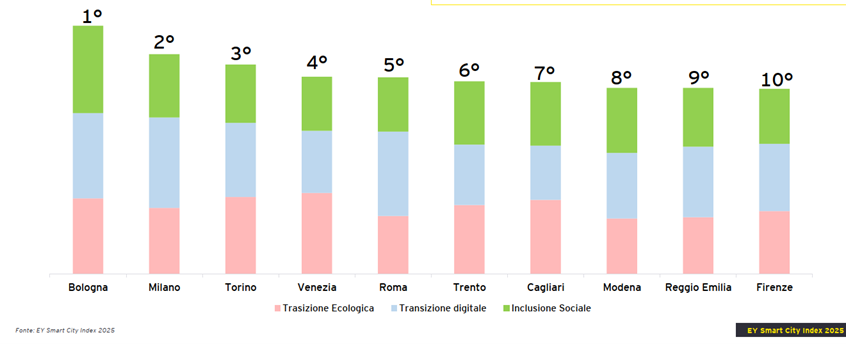 L'inclusione sociale misura l'equità e la coesione, considerando l'accessibilità ai servizi fondamentali, la riduzione delle disuguaglianze e il coinvolgimento dei cittadini nelle decisioni collettive. L’attenzione al fattore «human» da parte delle città copre principalmente tre ambiti: politiche e dinamiche sociali; digital engagement; attrattività, intesa come capacità di attrarre nuovi abitanti e nuove imprese. Basandosi su questi fattori, nell’EY Smart City Index 2025 Bologna è la città italiana più inclusiva, grazie al digital engagement e alla spesa per servizi sociali, seguita da Trieste, Pordenone, Modena, Cagliari, Milano, Trento, Pavia, Genova e Ravenna. Anche le città medie, come Modena e Trento, e le città piccole, come Pavia, dimostrano che è possibile competere con le città principali sugli aspetti umani.