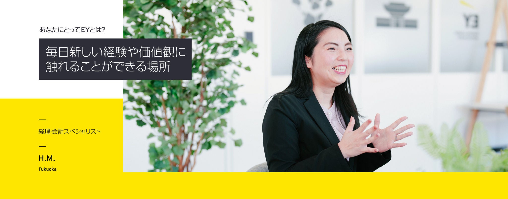 前職で会計の業務に触れる中で、もっと会計の世界を学びたい、経験したいと思い転職活動を始めました。その中でもEYはグローバル企業なので、多様な経験が積めることと、多様な価値観を学ぶことができると思い入社しました。また、面接の雰囲気も明るく、このような雰囲気の中で仕事ができたらすばらしい環境だろうなとも感じていました。