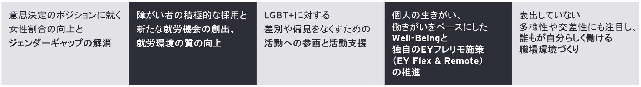EY は、多様な個の可能性を引き出し、その能力を最大限に発揮できる環境づくりに取り組んでいます。またその成果を自社内にとどめず、より良い社会構築に資する長期的価値の創出につなげることが重要だと考えています。