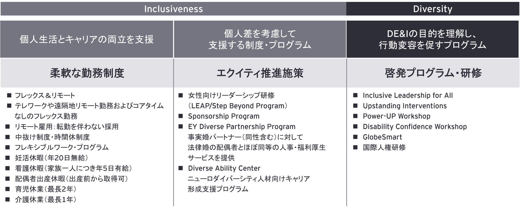 誰もが自分らしくいられ、尊重されるインクルーシブな社会を目指して。EYの競争力の源泉は、多様で高度なスキルを有するEYメンバーであり、それぞれの個性を生かし、創造性を育むインクルーシブな企業文化です。