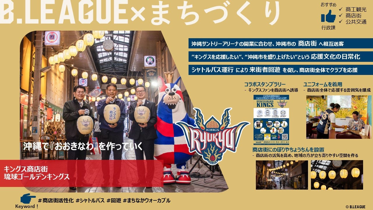 中心商店街がホームゲーム開催時に“応援の場”に変貌。Bクラブが行政や商店街と連携し、イベントやシャトルバス運行を通じて回遊とにぎわいを創出。