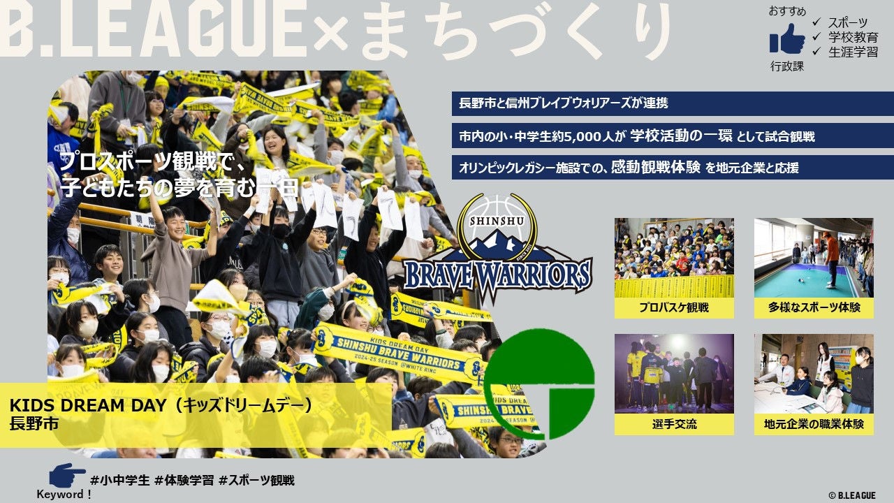 長野市主導で初のB.LEAGUE平日日中試合を実施。行政・企業・学校が連携し、5,000人の小中学生に夢の観戦体験を提供する教育連携型イベント。