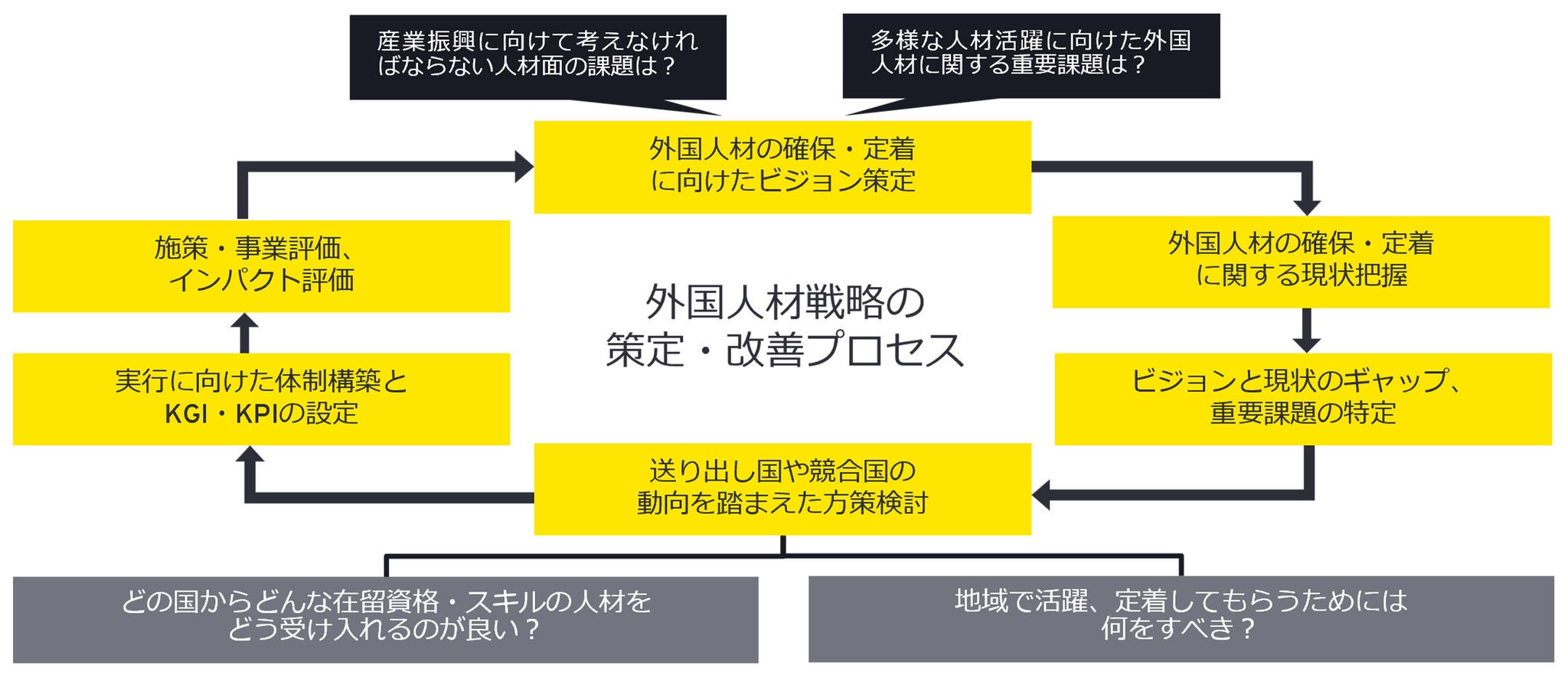 外国人材の送り出し国や先進諸国の最新動向、地域や企業の取組み事例等に関する調査研究を基盤として、外国人材戦略の立案から実行までの包括的なコンサルティングサービスを提供します。