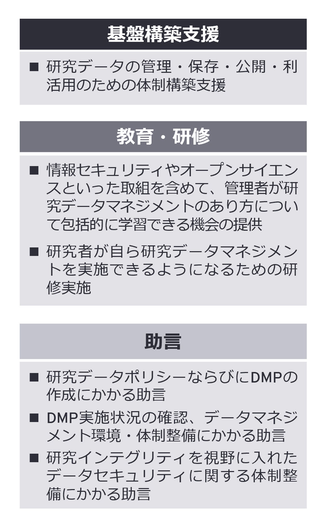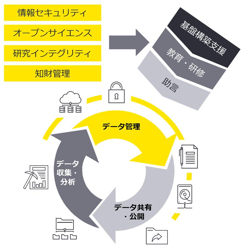 情報セキュリティやオープンサイエンス、研究インテグリティ、知財管理に関するこれまでの大学・研究機関支援の知見と経験を活かし、各組織に適した効果的・効率的な研究データマネジメントのあり方を提案します。また、教育・研修や基盤構築支援を通じて組織や個人による責任ある研究開発の自律的な取り組みを促します。