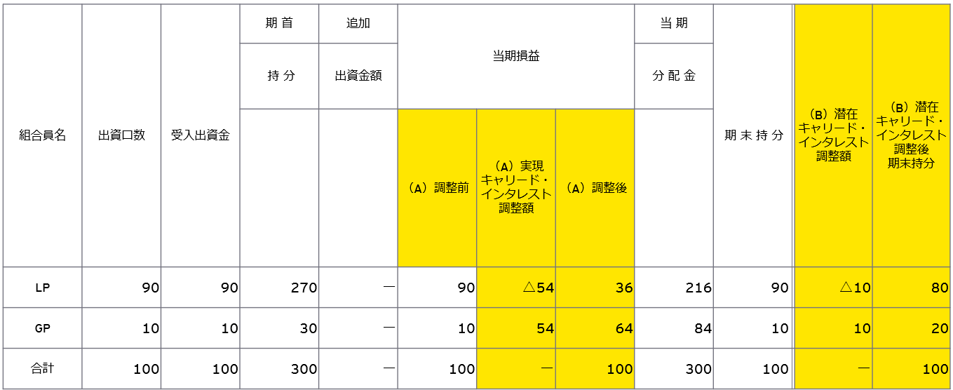 キャリード・インタレストが発生すると、無限責任組合員と有限責任組合員の間で取り分が変わるため、組合員間の持分を調整する必要があります。投資事業有限責任組合の運用者が投資資産の売却や償還などにより、実際に利益が確定した時点で受け取る優先分配(以下、実現キャリー)は、キャッシュ・フローの発生に基づいて認識されるため、明細表上も実際の分配が行われた時点で記載されます。実現キャリーによる調整後の持分が開示されることにより、実現キャリーの発生状況や組合員間の持分の変動が示されることとなります。