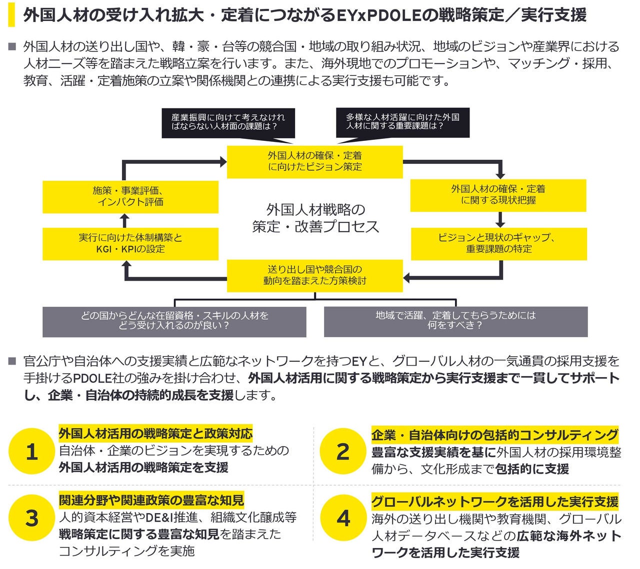 中務:外国人材も人的資本の重要な要素であり、EYでは企業の人的資本経営を総合的に支援しています。具体的には、企業における人的資本をどう考えるかといった点から、情報開示の方法、人材戦略の策定・実行まで、一貫したサポートを提供しています。また、地方自治体に対しては、少子化や地域産業の状況、人材に関わる定量指標を基に、教育、医療、商業施設といった生活基盤の現状分析や課題整理を行い、適切な施策の提案・実施を支援しています。