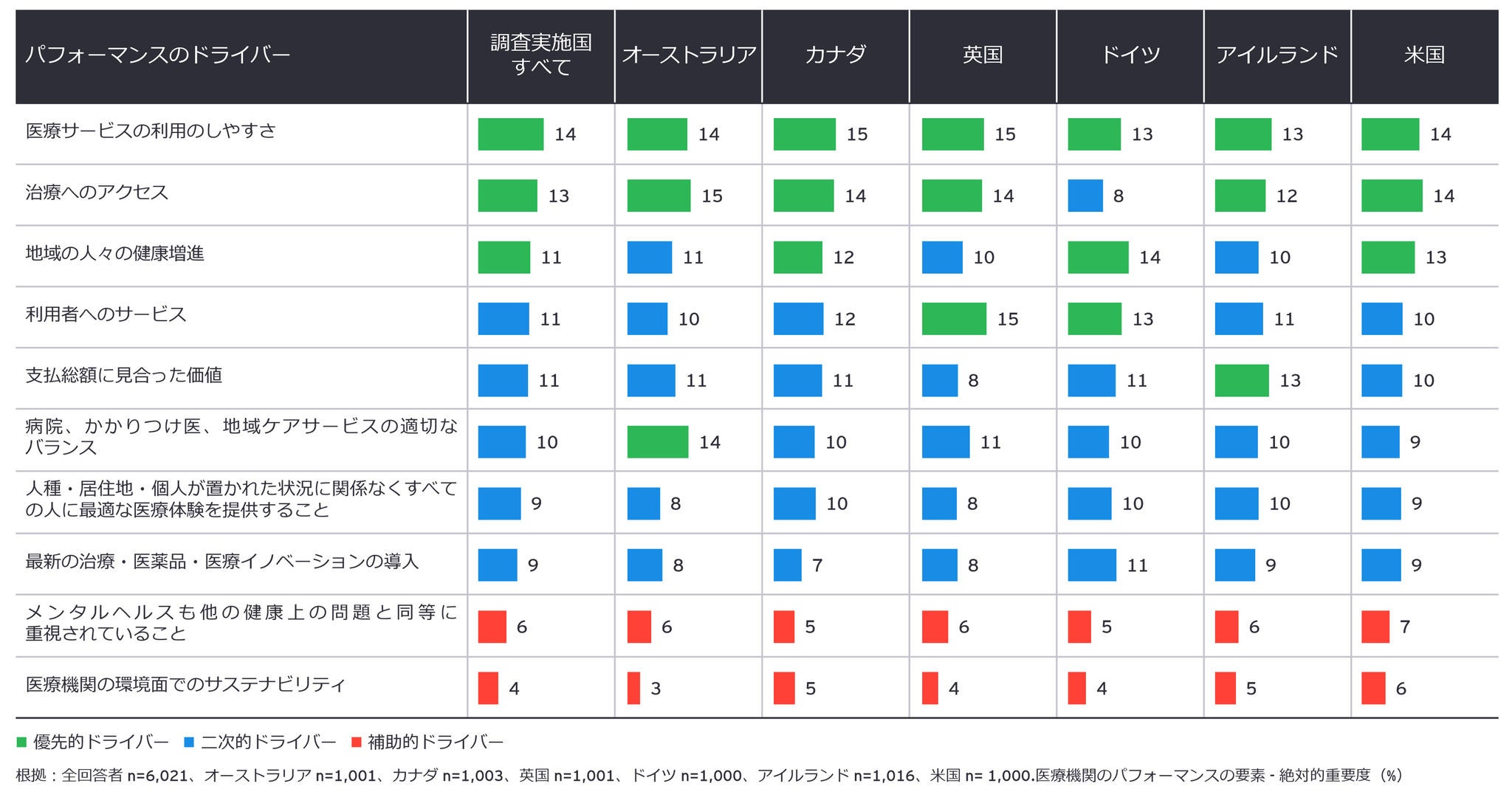 医療機関のパフォーマンスに関する利用者の評価を高める要因について理解を深めるため、ドライバー分析を実施し、医療機関のパフォーマンスに関する認識を決定づける種々の要因の相対的重要度を評価しました。