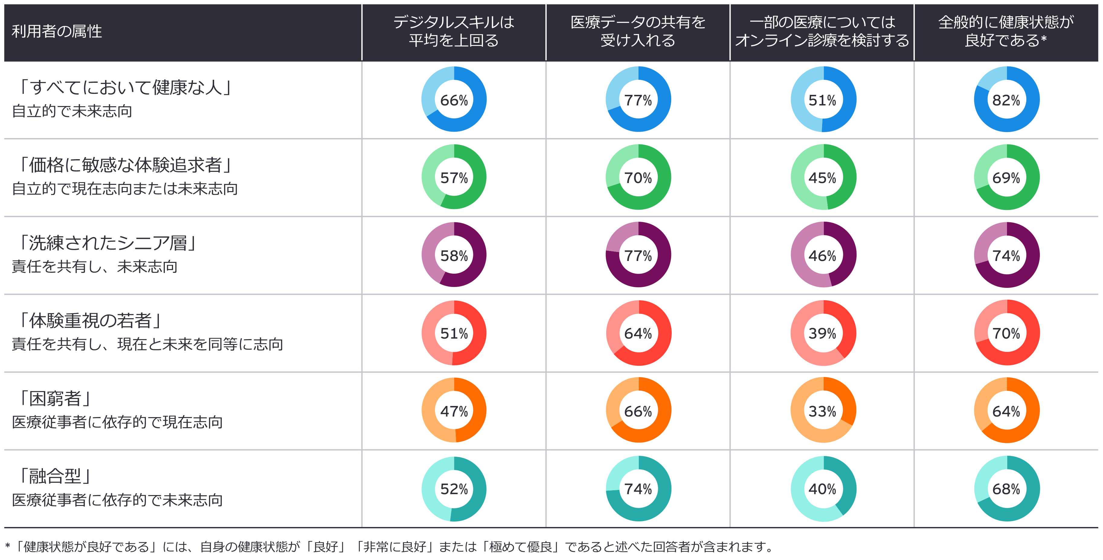 例を挙げましょう。今回のEY調査の最大のセグメントは、年齢が比較的高く(退職者を含む)、現在慢性疾患はなく健康状態が良好でありながらも油断することなく健康に気を配る人が多い層です。その約60%が、自身のデジタルスキルは人並みだと考えています。このセグメントを「洗練されたシニア層」とします。この層は、全般的に良好な健康状態の維持は、医療従事者と個人の双方の責任であると考えており、治療の決定に際しても部分的に関与する傾向があります。医療機関は、治療へのアクセスと医療体験について、データから引き出された知見と選好に基づいてこの層に適した戦略を考えることができるでしょう。